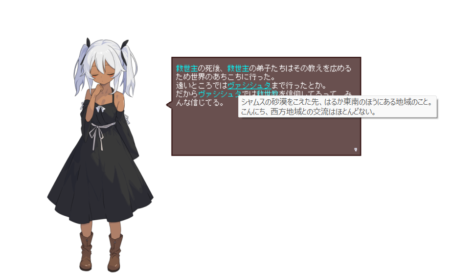Такая фишка в целом есть у большинства скринмейтов, не только у Ukagaka, но она здесь довольно развитая, и интерактивные области могут быть разными, в зависимости от оболочки. Один персонаж может иметь довольно много интерактивных областей, и соотвественно различных реакций на действия пользователя. - Интерактивный текст — небольшая но очень классная фишка. Ещё с TES III Morrowind мне казалось что такой дизайн диалогов используется преступно редко. Позволяет добавить своему персонажу немного лора не выделяя на него отдельных реплик, чтобы диалог всё ещё звучал естественно.